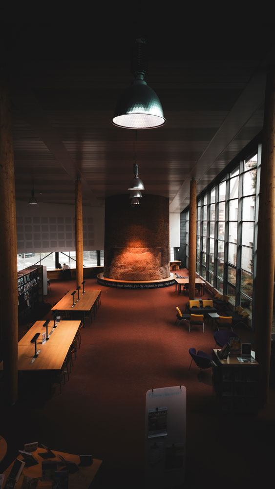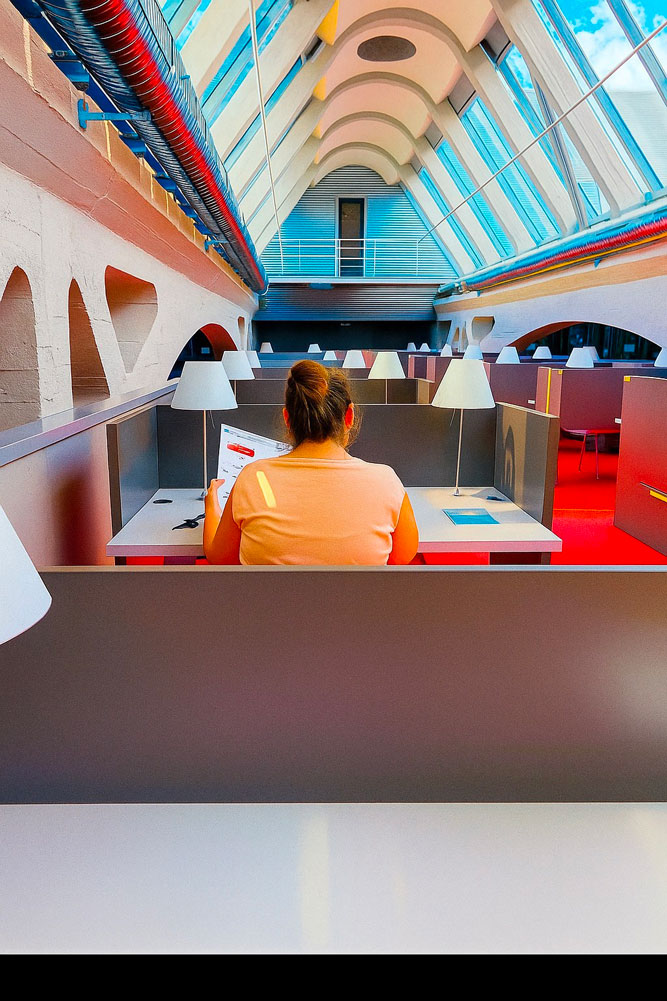 « Photo prise d’un moment de révision et de réflexion. Dans un cadre suspendu, hors du temps et du silence. Les voûtes de l’ancienne fonderie se marient avec le cadre de la bibliothèque universitaire.«