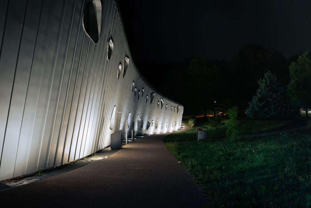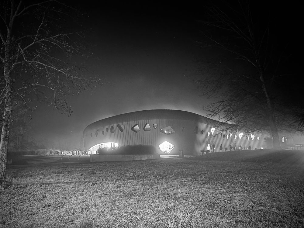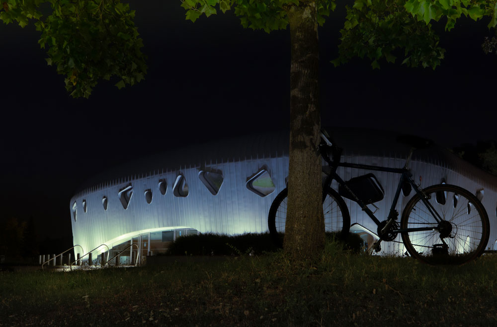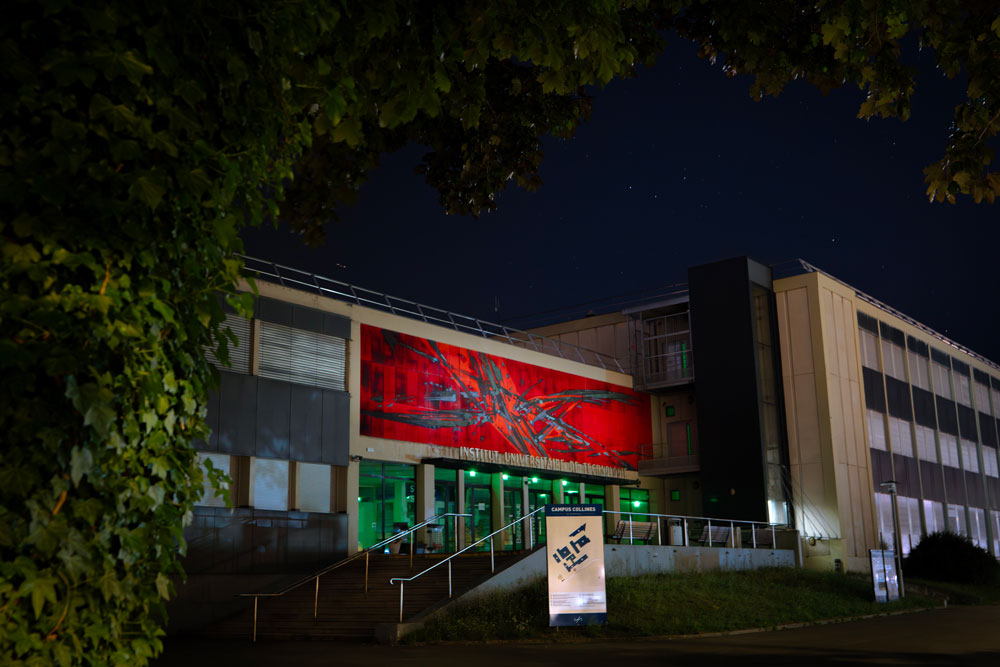 « Entrée de l’IUT de Mulhouse (campus Collines), photographiée de nuit en pause longue. Le bâtiment, bientôt prêt à accueillir les étudiants en septembre, est mis en valeur, encadré par la végétation et illuminé par les étoiles.«