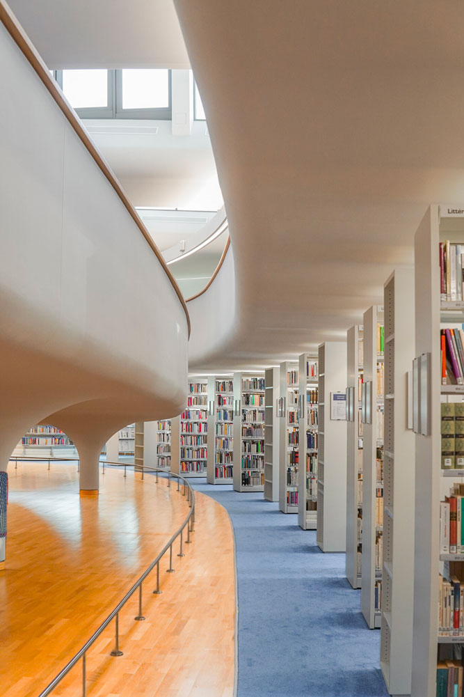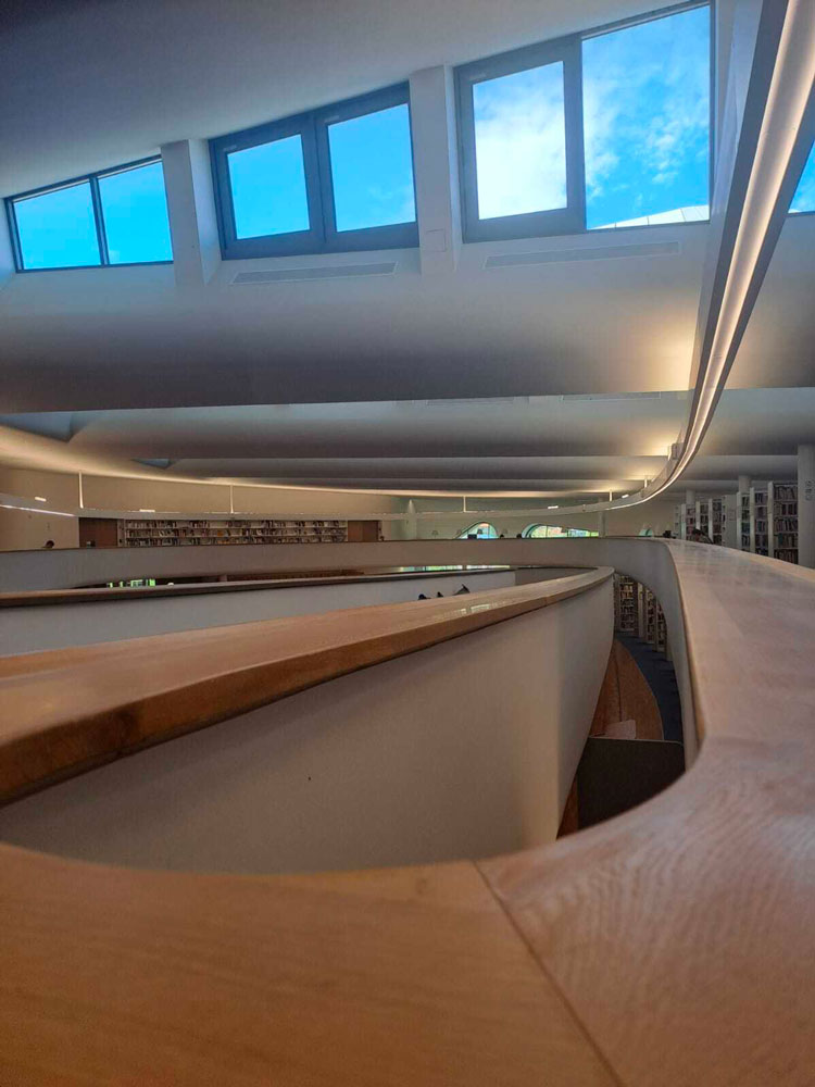 « Les rayons s’élèvent comme une forêt claire. Chaque livre est un monde, une étoile à éclairer. Sous la passerelle blanche aux courbes légères, les pas deviennent rêves, les pages s’animent, légers.«