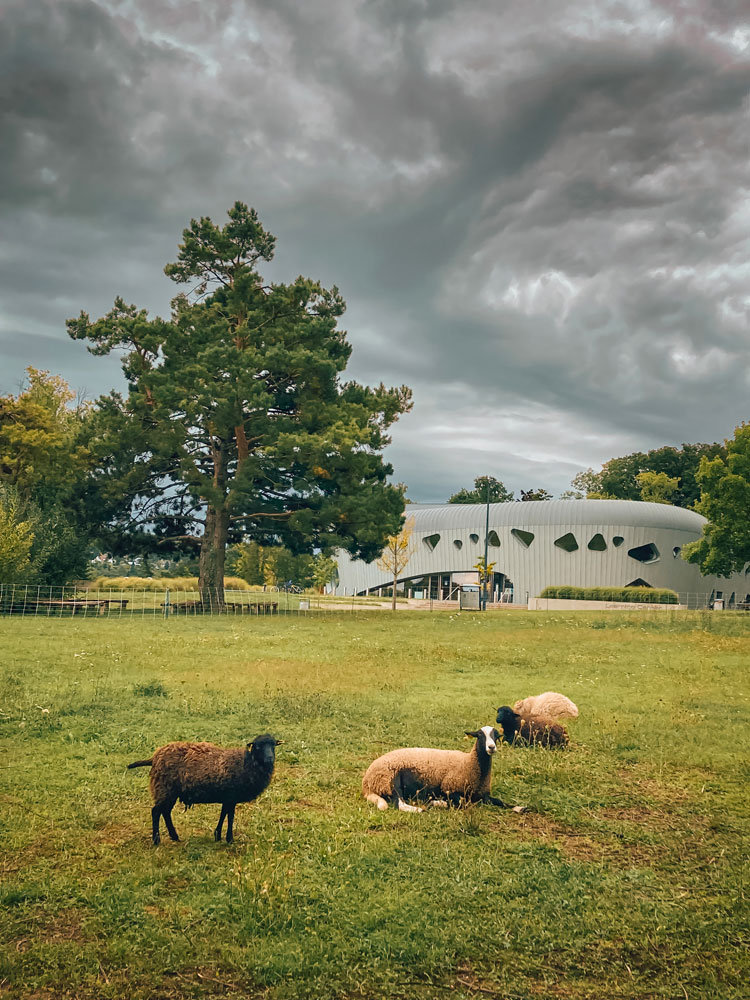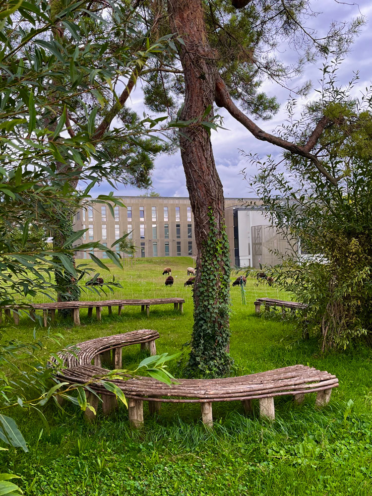 « Le Banc Vivant en châtaignier (projet participatif) et les moutons d’Ouessant dans la Prairie devant l’ENSCMu et l’ IRJBD – Institut de Recherche Jean-Baptiste Donnet.«