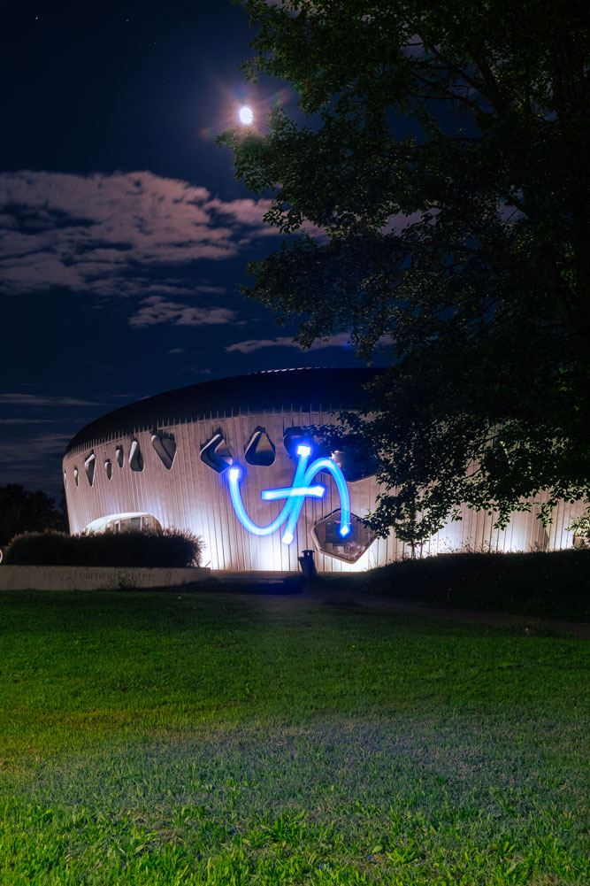 « Photo de nuit avec la lune qui rayonne et light painting du logo de l’UHA avec le Learning Center Illberg en fond.«