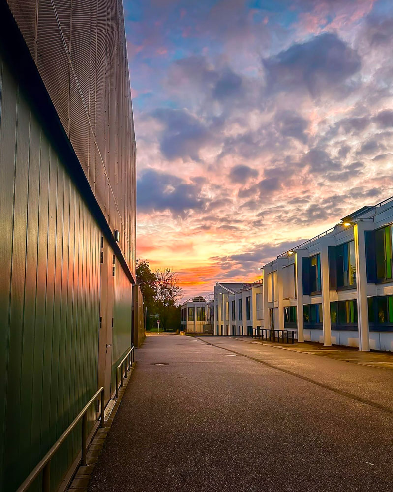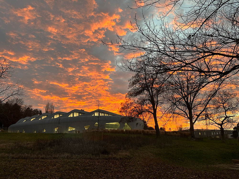 « La vue du Learning Center sur le campus au coucher de soleil.«