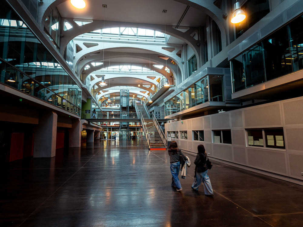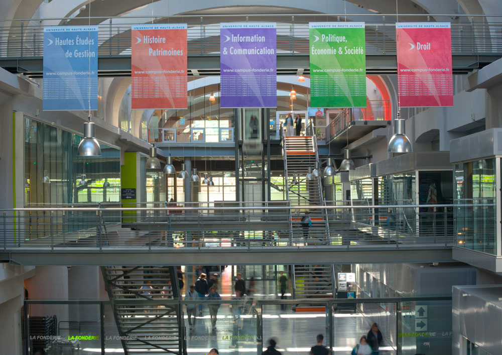 « Entre ses murs, sous ses arches et ses verrières, se croisent étudiant.e.s et enseignant.e.s. Cinq bannières suspendues flottent tels des vitraux dans cette nef contemporaine, guidant les pas vers le savoir. Dans ce sanctuaire laïc, apprendre est l’unique rituel.«