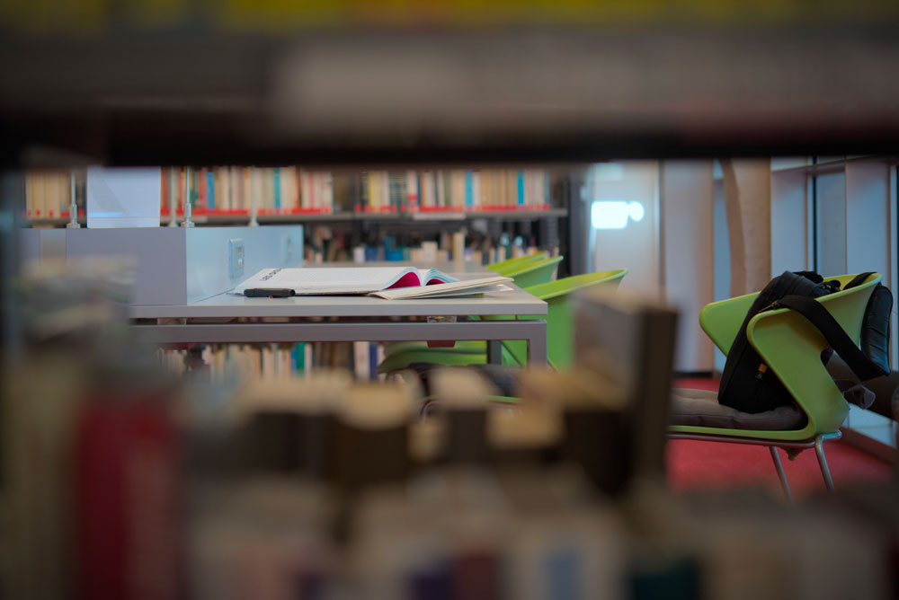 « Entre deux étagères, une table attends. Des livres entrouverts gardent la trace d’une lecture interrompue. Cette parenthèse de silence est brève et laissera à nouveau place aux chuchotements et au bruit des pages qui se tournent.«
