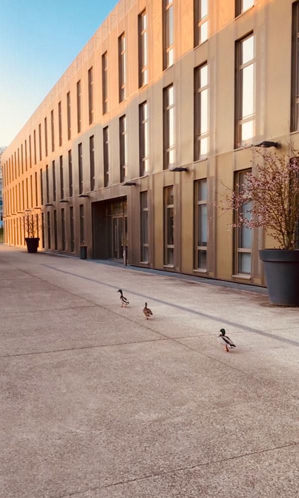 « Trois canards profitent du calme matinal pour se promener devant les bâtiments du campus. Une scène insolite qui rappelle la proximité de la nature avec ce lieu de savoir et de recherche.«