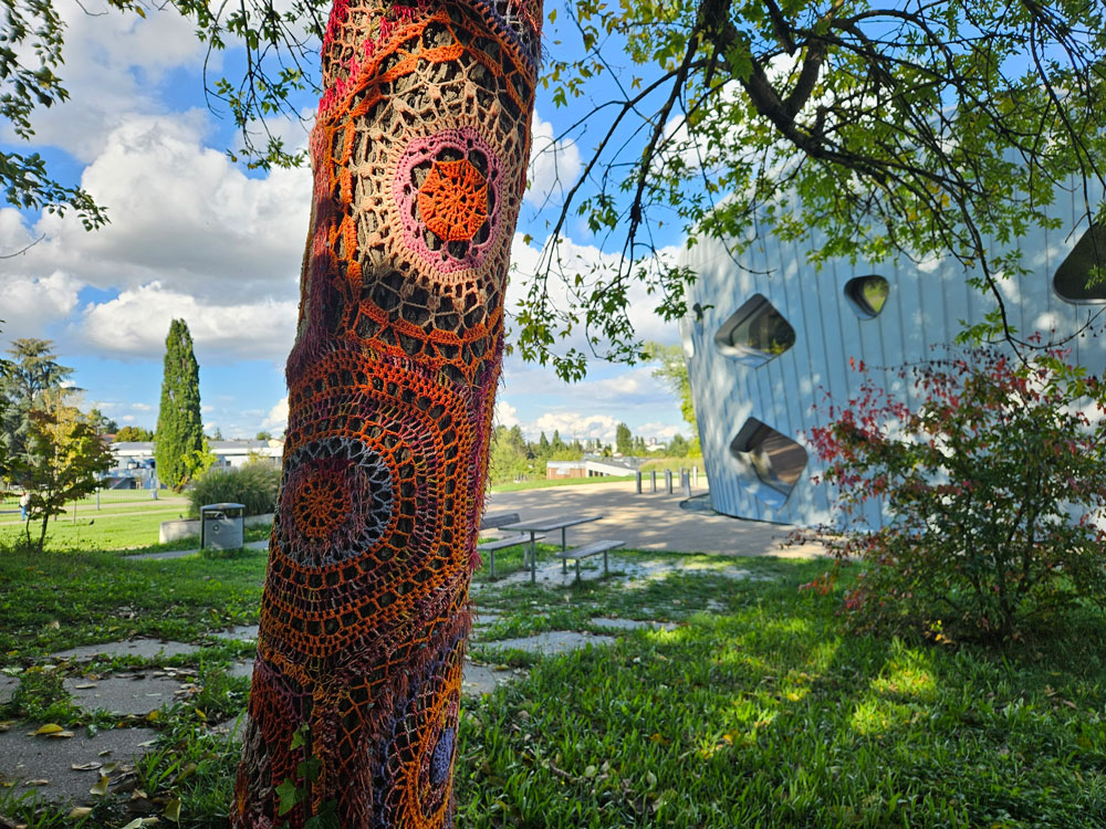 « Il s’agit de la mise en lumière de l’espace repos près du Learning Center. Le soleil d’automne révèle toutes les couleurs orangées de l’arbre maillé. La verdure et le ciel bleu sont aussi de la partie pour cette explosion de couleur.«