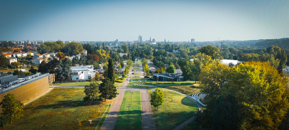 « Photographie du campus Illberg au drone avec une vue sur Mulhouse et sa tour de l’Europe au loin.«