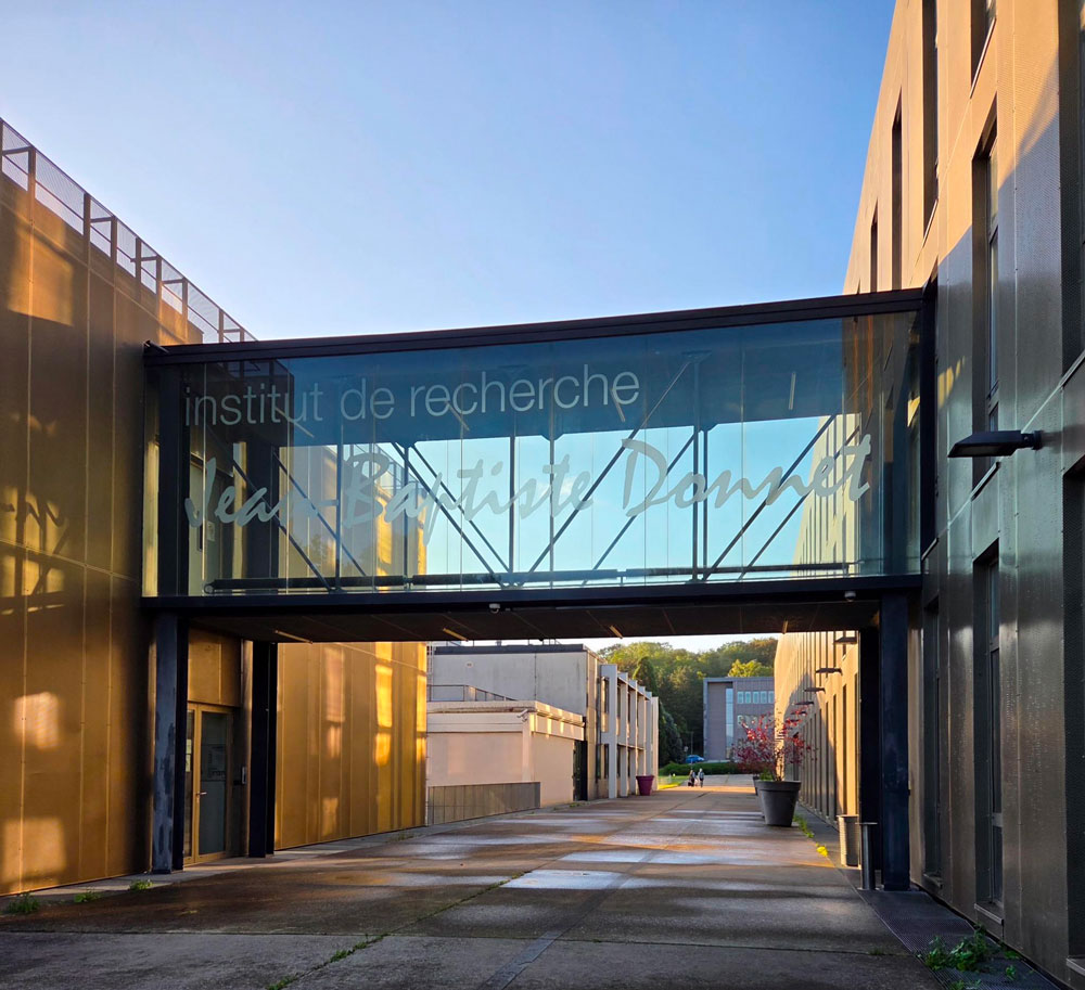« Cette passerelle se situe entre l’institut de recherche Jean-Baptiste Donnet (IRJBD) et l’École Nationale Supérieure de Chimie de Mulhouse (ENSCMu). Elle illustre le lien fort entre les différents laboratoires de recherche et les étudiants.«