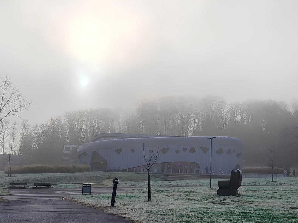 « Photo prise un matin d’hiver sur laquelle on voit le Learning Center qui se fond dans le décors brumeux.«