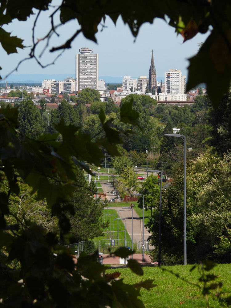 « En haut de la colline du campus de l’Illberg on ne peut qu’admirer cette vue emblématique. On y voit le centre-ville de Mulhouse, le campus mais aussi les montagnes en arrière-plan. En surplombant le campus, on peut le voir s’étaler de tout son long mais aussi se rendre compte comment il est implanté dans la végétation. C’est ce lien étroit avec la nature, qui nous entoure tous les jours sur le campus, que j’ai souhaité mettre en avant à travers la végétation qui encadre la photo.«