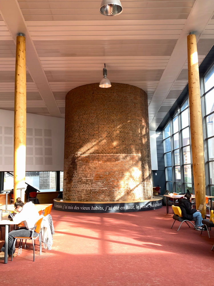 « Lors d’une visite du Learning Center de Colmar, je découvre cette cheminée imposante au milieu de la bibliothèque, vestige de l’ancienne filature Berglas-Kiener créée en 1829. Des paroles d’anciens ouvriers habitent les murs de la bibliothèque, et l’une d’elles décore désormais la cheminée : « Il y avait des crochets dans la cheminée, j’ai mis de vieux habits, j’ai été en haut, le pire c’était de descendre.«